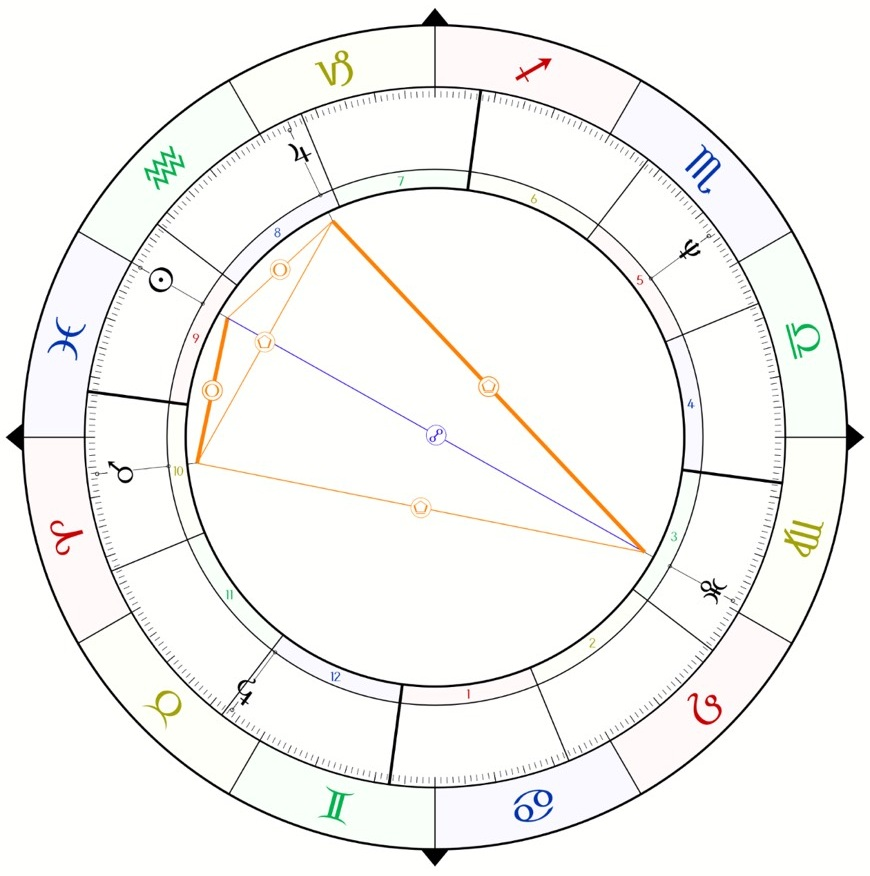 さらに、ピーボディはこの5分割で出来た美しいカイトを持っています。カイトとは、中心軸に2つの天体が180度を貫き、左右対称にソフトアスペクトを作る凧のような形からその名がついた惑星配置です。水瓶座太陽・乙女座天王星を軸にしたこのカイトは、自分が他者より抜きんでて、独立独歩の独創性でいままでに誰もやらなかったことに果敢に挑戦し開拓し、イギリスの商業銀行において不動の地位を得るということを表しています。