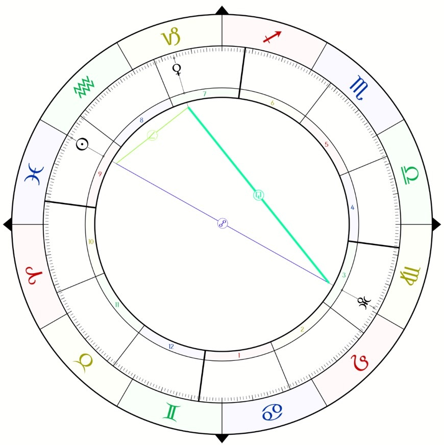 お金の管理に関係する惑星は金星と土星。特に90度で関与するとお金(金星)を閉じ込めてしまう(土星)ということで倹約になりがちで、調停する天体がないとお金を使う事に関して葛藤を生んだり苦い経験をしがちになりますが、ピーボディの場合は金星と土星のアスペクトを持ちません。そのかわり牡牛座の支配星である金星が山羊座に、山羊座の支配星である土星が牡牛座に入る形になり、惑星がお互いの働きを強化・補完しあいます。金星は豊かさの象徴であり、その一つがお金になるわけですが、ピーボディの金星はそもそも土星的な制約を受ける金星なので、何かを楽しむよりも“蓄えることそのもの”に価値を見出す傾向が強くなります。また、金星は水瓶座の太陽ともセミスクエアを形成し、天王星とは135度のハードアスペクトを取ります。その影響により、金星は表現が内側に閉じていき、一般的な楽しみを見つけにくくなります。結果として、蓄財そのものに喜びを見出す傾向が強まるのです。