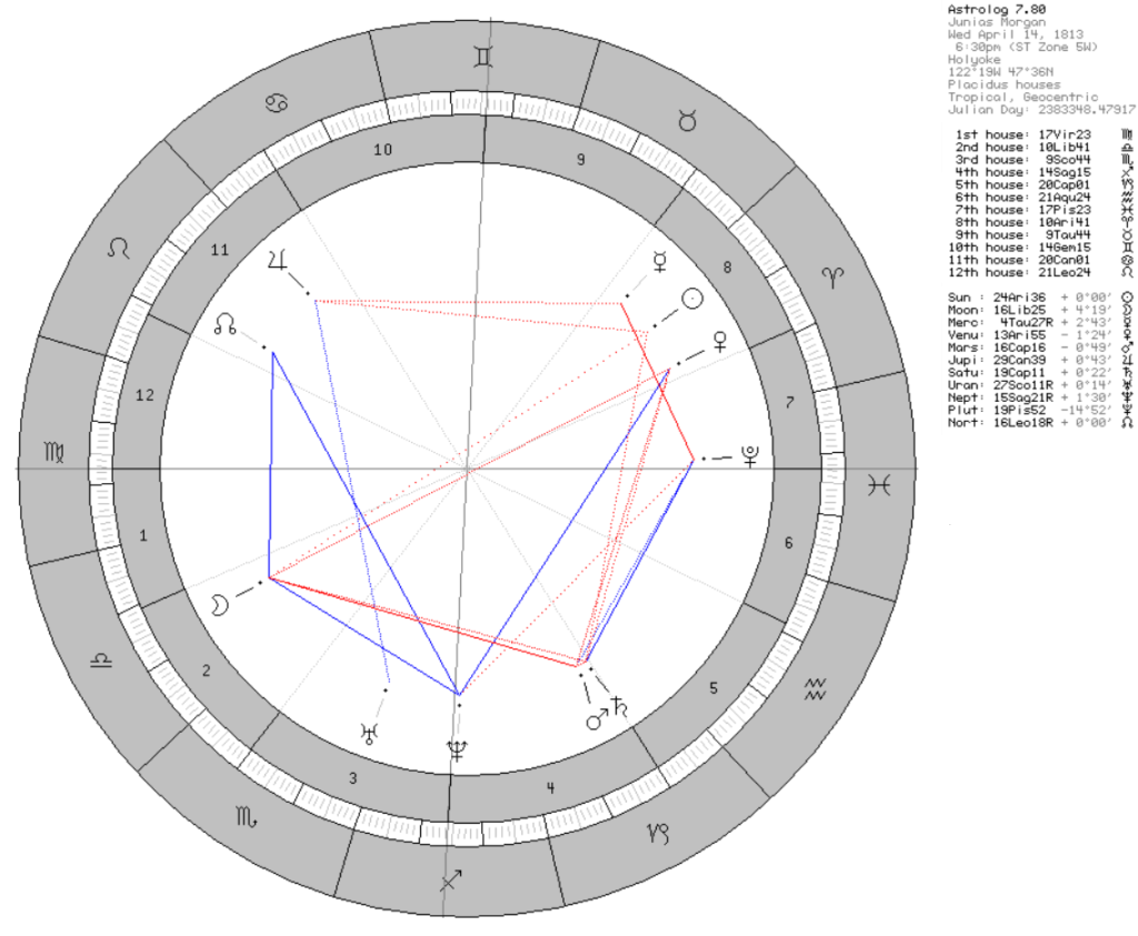 記事トップの出生図は出生時間が不明なので正午12時で出していますが、ジューニアスは遺産を継承してビジネスを拡大させ、ピーボディからも事業を継ぐ形でビジネスを発展させています。そのほかにも伝記に記されたものを重ね合わせてみると、個人的には夕方6時半前後の生まれなのではないかと推測します。上記のような出生図だと、ジューニアスの太陽や水星は継承の8ハウスに入り、海王星は3ハウスと4ハウスの間に入ります。大きな邸宅をいくつも持ち、ニューヨークにいる息子のピアポントとロンドンにいるジューニアスが毎年お互いの邸宅を訪ねていたことにも符合しますね。またお金に関する2-8ハウスに月・太陽が入り、創造や投機がテーマの5ハウスにある火星・土星と関係して、投資によって資産を拡大していきます。ジューニアスの牡羊座太陽は右手に蟹座木星、左手に山羊座土星に90度で緩く挟まれる格好になっています。木星の度数は「アメリカ革命の娘」という象意です。アメリカから海を渡り意気揚々と新しい地において金融業を始めたピーボディと、その後を引き継ぎイギリスにおいてアメリカを代表する金融資本家となったジューニアスを象徴するような蟹座木星です。また、土星は山羊座にあり、土星の象意を二重に強調します。土星は火星と合で牡羊座の金星とタイトにスクエアを形成し、事業において一人で何でもやる多彩な才能と、高く大きく掲げた目標に自らを抑圧するような息苦しさも見えてきます。ジューニアスは銀行家特有の用心深い雰囲気がありました。まるで彼の人生に、屈託のない若者時代はなかったかのようで、しかめっ面で商売一筋で、いつも感情を抑えて表に出しませんでした。